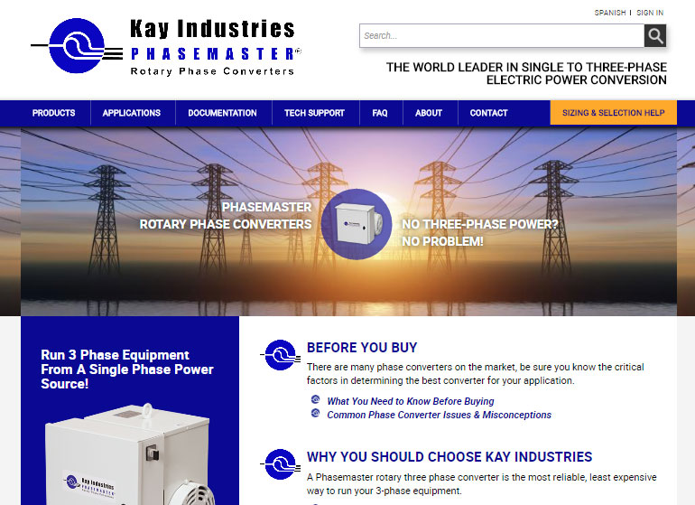 When it comes to Single Phase to Three Phase electrical Converters, Kay Industries is the brand name. An industry trend setter, it has been responsible for introducing and leading many innovations and changes in the markets over the decades. From Rotary converters to Automatic controls to money back performance guarantee and National Toll Free Line, Kay Industries was the first to introduce these Parameters. They have a major presence in United States, South and Central America and the Pacific Rim.